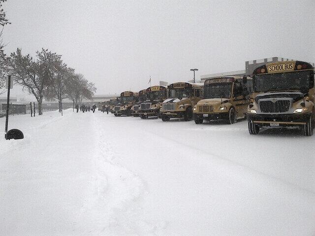 The buses were lined up at 3:00 this afternoon, ready for the middle and high school kids to get on board for their ride home. Evening activities were cancelled including church youth, so Toni and I are spending a rare Wednesday evening at home. I didn't even go into the church office as usual after the PM route (which was about 20 minutes slower than usual). I came right home and shoveled the driveway. Now the wind has come up and the temps are falling. It's a good night to stay put.